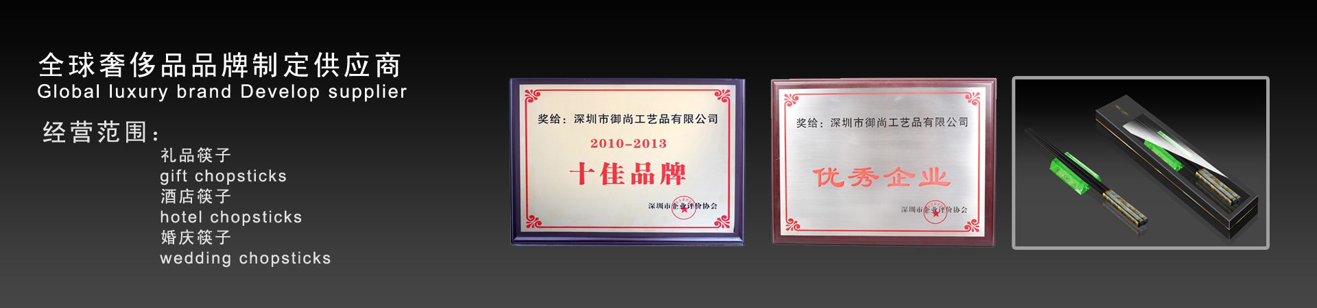 御尚健康產(chǎn)業(yè)(深圳)有限公司旗下御尚工藝筷子榮獲深圳市企業(yè)評價協(xié)會授予的2013年度“優(yōu)秀企業(yè)”和年度“十佳品牌獎”稱號。 深圳市御尚工藝品前身為深圳市御尚工藝筷子廠,是御尚健康產(chǎn)業(yè)(深圳)有限公司和香港御尚實業(yè)有限公司全資子公司,是一家專業(yè)從事高檔筷子及紅木工藝品設(shè)計,研發(fā)和銷售及生產(chǎn)為一體的專業(yè)供應(yīng)商,位...【更多詳情】